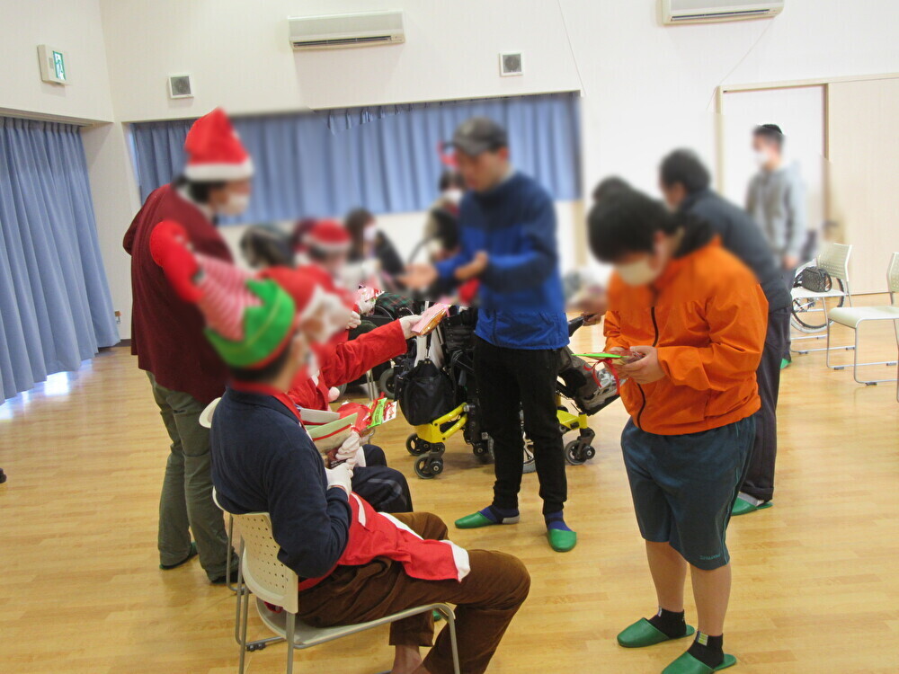 終わる前に手作りカード入りのお菓子を配る際に来ていただいたお客さんとコミュニケーションをとっていて、利用者もお客さんも楽しそうな笑顔でした。